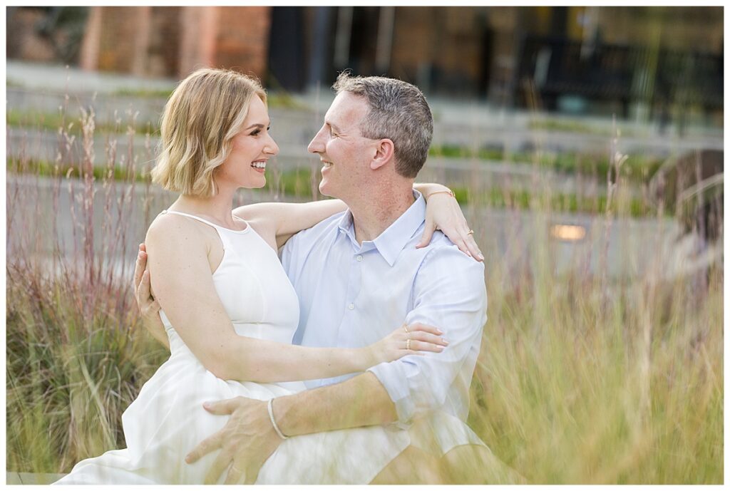 We moved through several iconic spots in Downtown Richmond. First, we captured them in front of the historic Tredegar Iron Works building. The massive wooden doors and aged brick created a dramatic, timeless backdrop. Next, we wandered to the open plazas along the James River. The tall ornamental grasses swayed softly in the breeze. The warm light filtered through the trees beautifully.